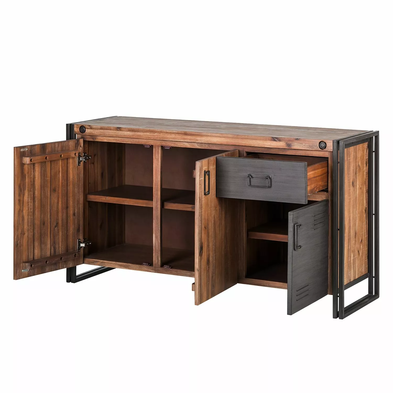 Das Sideboard Manchester von ars manufacti begeistert mit einem Materialmix aus Akazienholz und Metall und bringt so den angesagten Industrial-Style in Deine vier Wände. Und der Industrial-Stil hat Charme! Das Sideboard ist sehr robust, bekommt aber aufgrund des Gestells aus pulverbeschichtetem Metall einen leicht schwebenden Charakter. Gerade die filigranen Komponenten am Gestell verleihen dem Möbel industrielle Ästhetik.