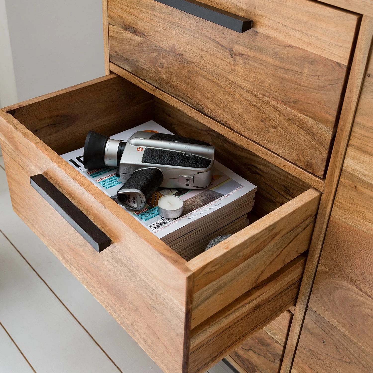 - Front & Korpus: Massivholz Akazie, lackiert