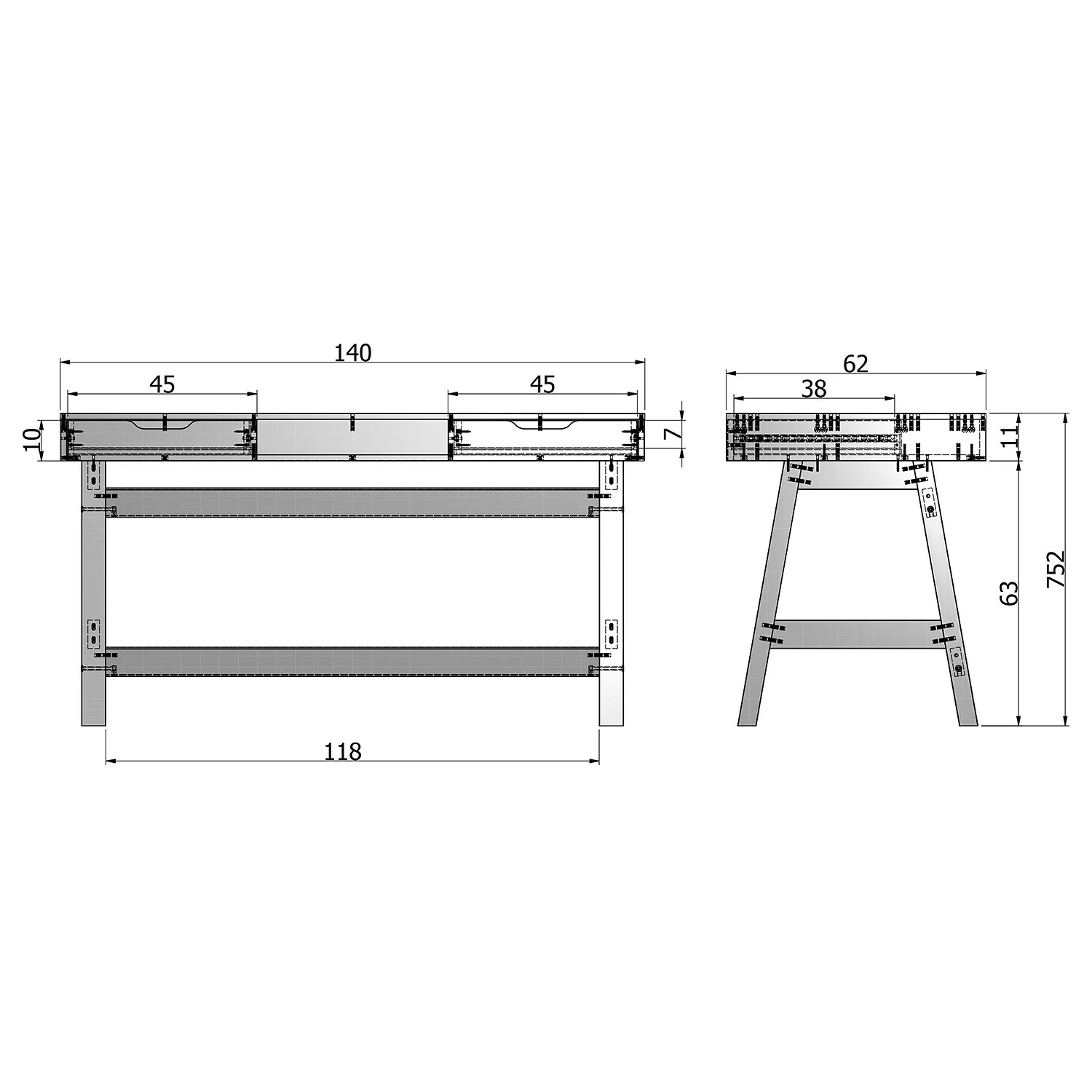 - Innenmaße Schubladen: 7 x 45 x 38 cm
