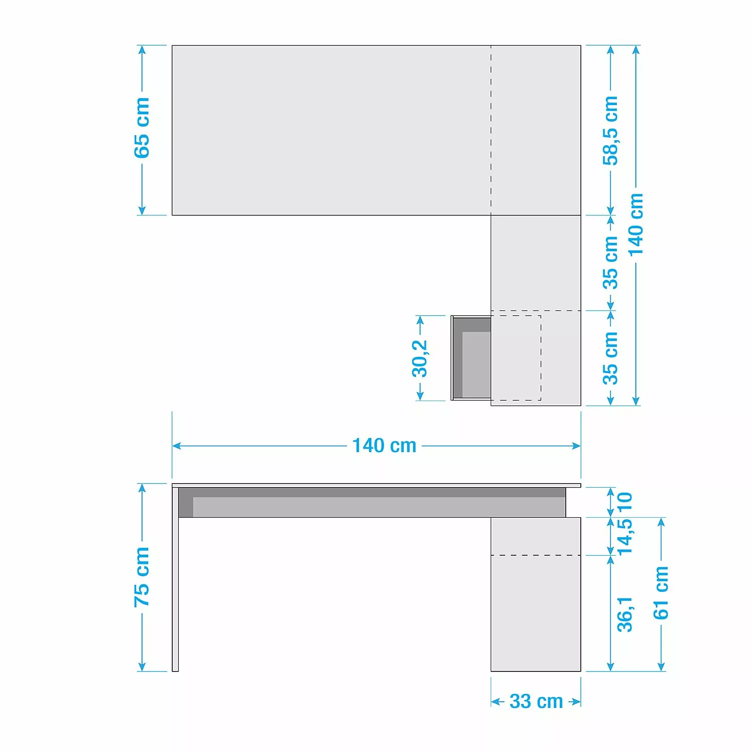 - Arbeitsplatte: 140 x 75 x 65 cm