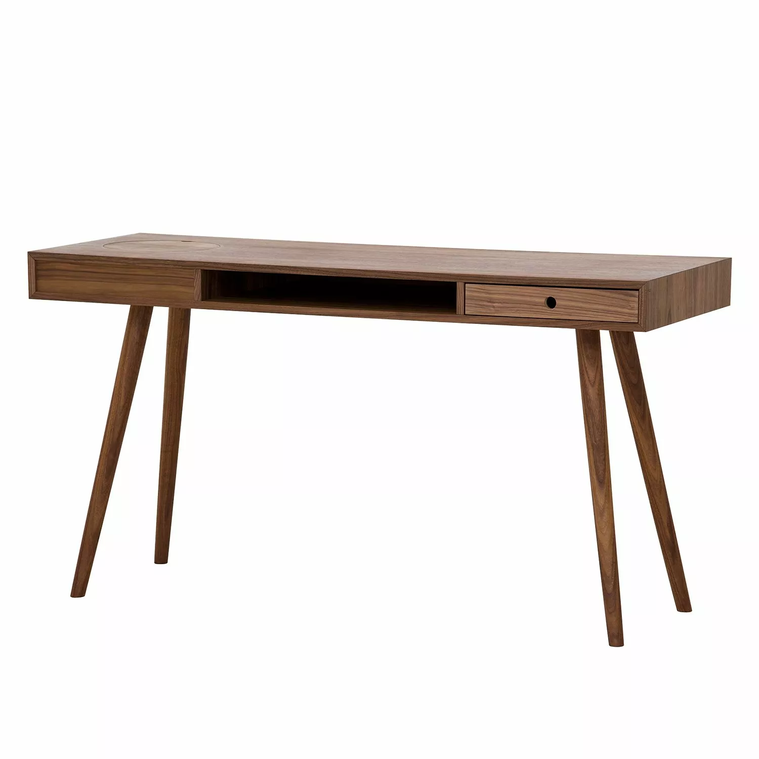 Der Schreibtisch Kierkegaard präsentiert sich in geradliniger puristischer Form mit schlanken Proportionen und passt sowohl zu einer modernen skandinavischen Einrichtung als auch zu Möbeln im Retro-Design. Dezentes Design kombiniert mit hoher Funktionalität, machen das elegante Möbelstück zu etwas ganz Besonderem. Front und Korpus des Schreibtisches Kierkegaard sind aus hochwertigen MDF-Platten gefertigt. Einen extravaganten Blickfang bilden die aus massivem geölten Walnussholz gefertigten schlanken schräg gestellten Beine des Tisches. Eine Schublade, ein offenes Fach sowie ein Stauraum mit Kabeldurchlass bieten Ablagefläche für Papiere und kleinere Gegenstände.